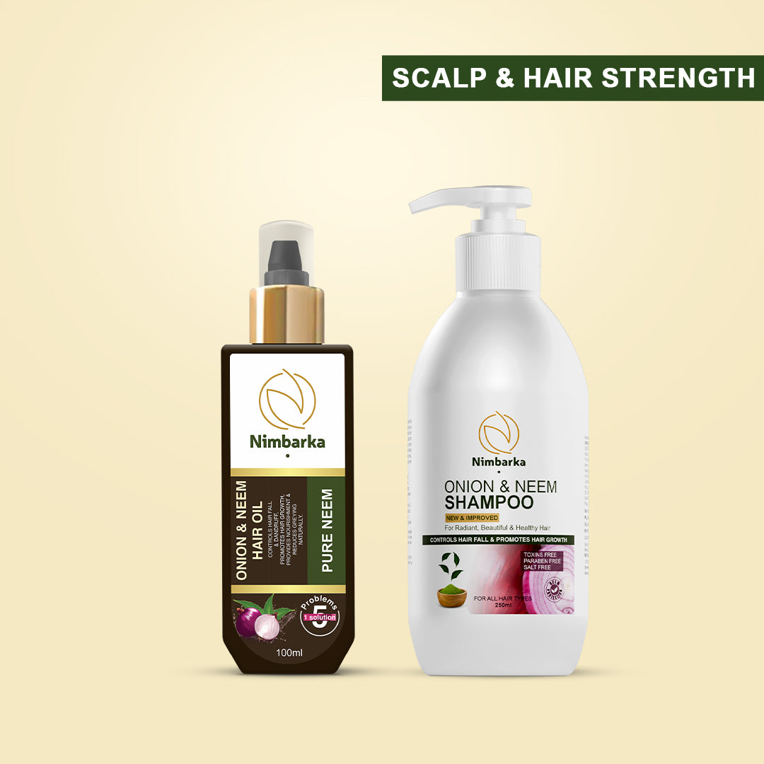 Nimbarka Anti-Hairfall Growth Duo is a powerful 2-step solution to tackle hair fall and promote strong, healthy hair growth. This duo includes Onion & Neem Hair Oil, rich in sulphur, potassium, and antioxidants to nourish the scalp, reduce breakage, and boost regrowth, and Onion & Neem Shampoo, which gently cleanses, fights dandruff, and strengthens weak roots. Together, they improve scalp health, restore shine, and leave hair smooth, frizz‑free, and voluminous.