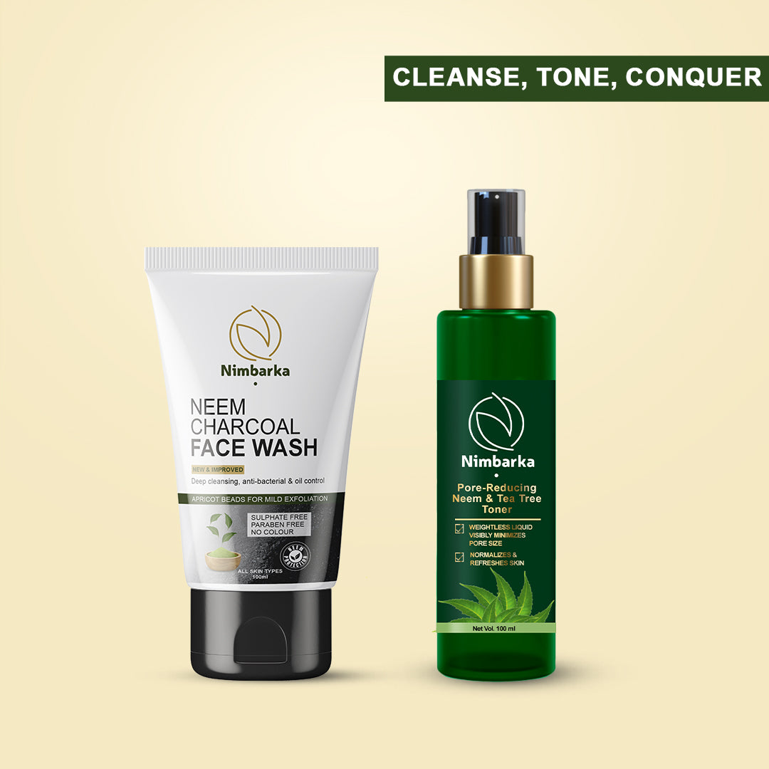 Nimbarka Charcoal Magic Duo is a detoxifying skincare combo crafted to cleanse, purify, and refine pores for visibly clear, refreshed skin. The Neem Charcoal Face Wash with activated charcoal, neem, and apricot beads removes dirt, oil, and impurities while controlling acne-causing bacteria and excess sebum. Follow with the Neem & Tea Tree Toner, an alcohol-free formula that minimizes pores, balances pH, soothes irritation, and refreshes skin for a smooth, glowing finish. Perfect for all skin types, this duo leaves your skin purified, balanced, and radiant.
