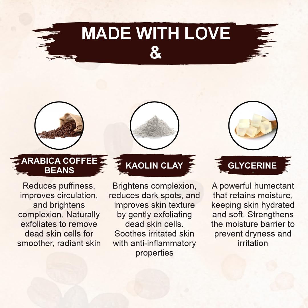 Aqua, Azadirachta indica, Aloe Barbadensis, Allantoin, Alpha-Arbutin, Coffea Arabica Seed Powder, Ceto Cetyl Alcohol, Cetyl alcohol, Caprylic Capric Triglyceride, Eugenia Caryophyllus Bud Oil, Fragrance, Glycerine, Honey Extract, Kojic Acid, Kaolin, Milk Protein, Niacinamide (Vitamin B3), Phenoxyethanol, Phenoxyethanol (and) Benzoic Acid (and) Capryloyl Glycine (and) Undecylenoyl Glycine, Rosa Damascena Mill Water (Rose Water) Ext., Sodium Phytate, Stearic Acid, Xanthan Gum