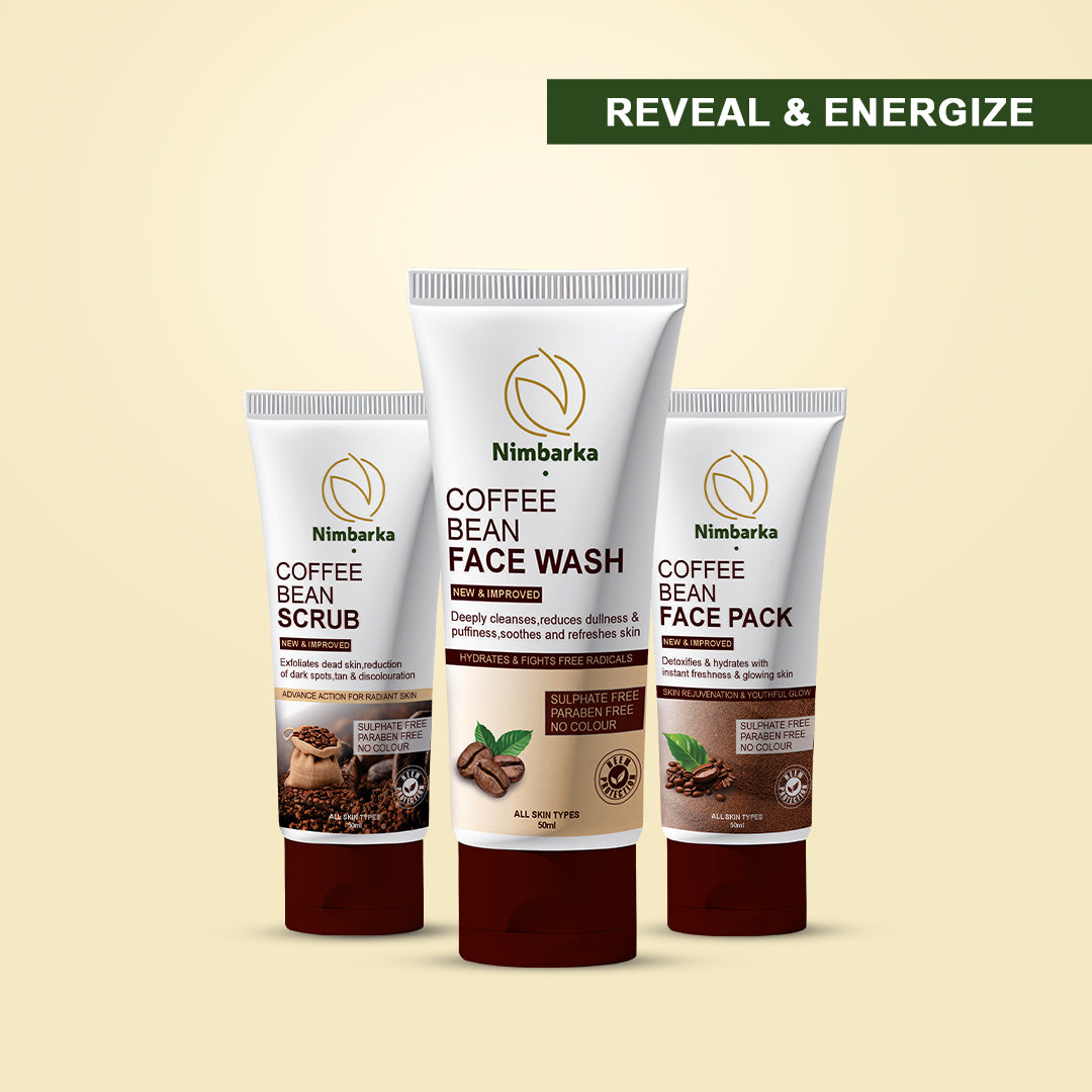 Nimbarka's Coffee Glow Kit is a 3-step skincare combo designed to cleanse, exfoliate, and nourish your skin for an instant glow. This kit includes Coffee Bean Face Wash to remove dirt and dullness, Coffee Bean Scrub to exfoliate dead skin cells and unclog pores, and Coffee Bean Face Pack to detoxify, hydrate, and rejuvenate the skin. Enriched with pure Arabica coffee and natural antioxidants, this kit helps reduce tan, dark spots, and discoloration while improving skin texture and radiance. This kit awakens your skin, helps reduce puffiness, and leaves it refreshed and glowing.