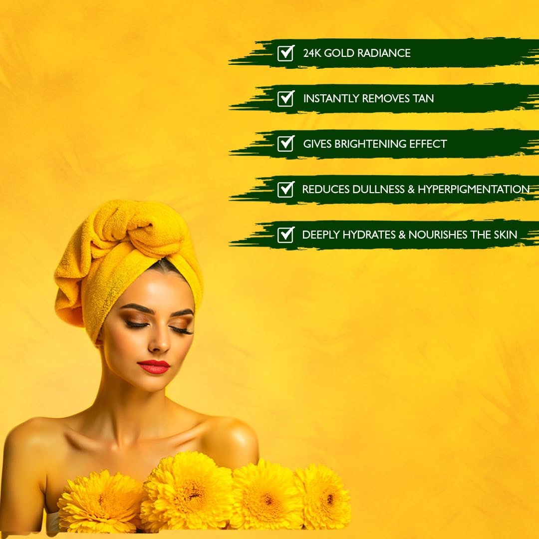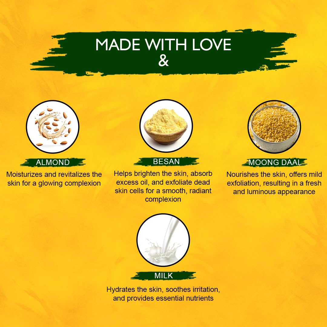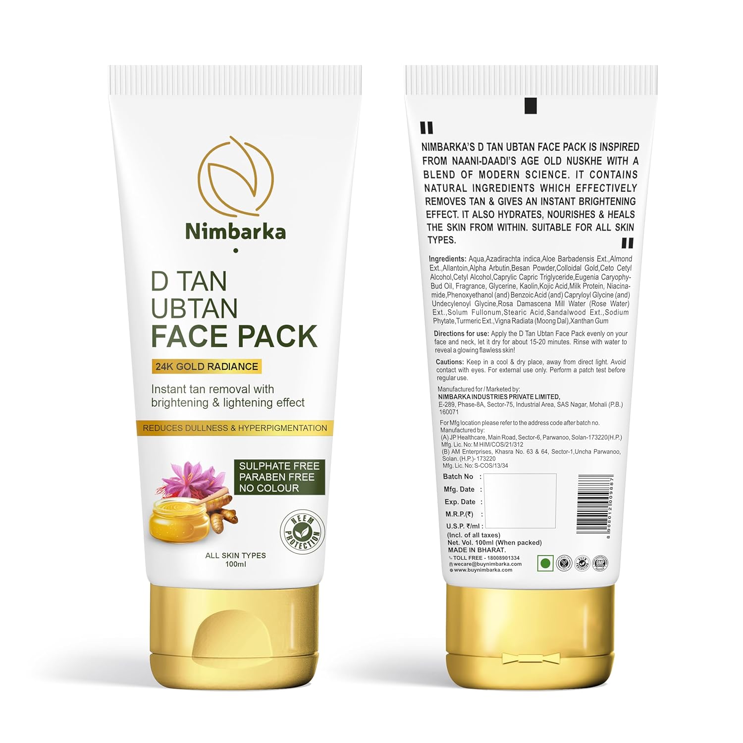 Say goodbye to tan and dull skin with Nimbarka D-Tan Ubtan Face Pack. Made with milk, besan, almond, moong daal, haldi, kesar & 24K colloidal gold, it’s a modern twist on age-old naani-daadi ke nuskhe. This natural ubtan helps remove tan, reduce hyperpigmentation, and instantly brighten your skin. Infused with kesar & gold, it leaves you with a radiant golden glow.