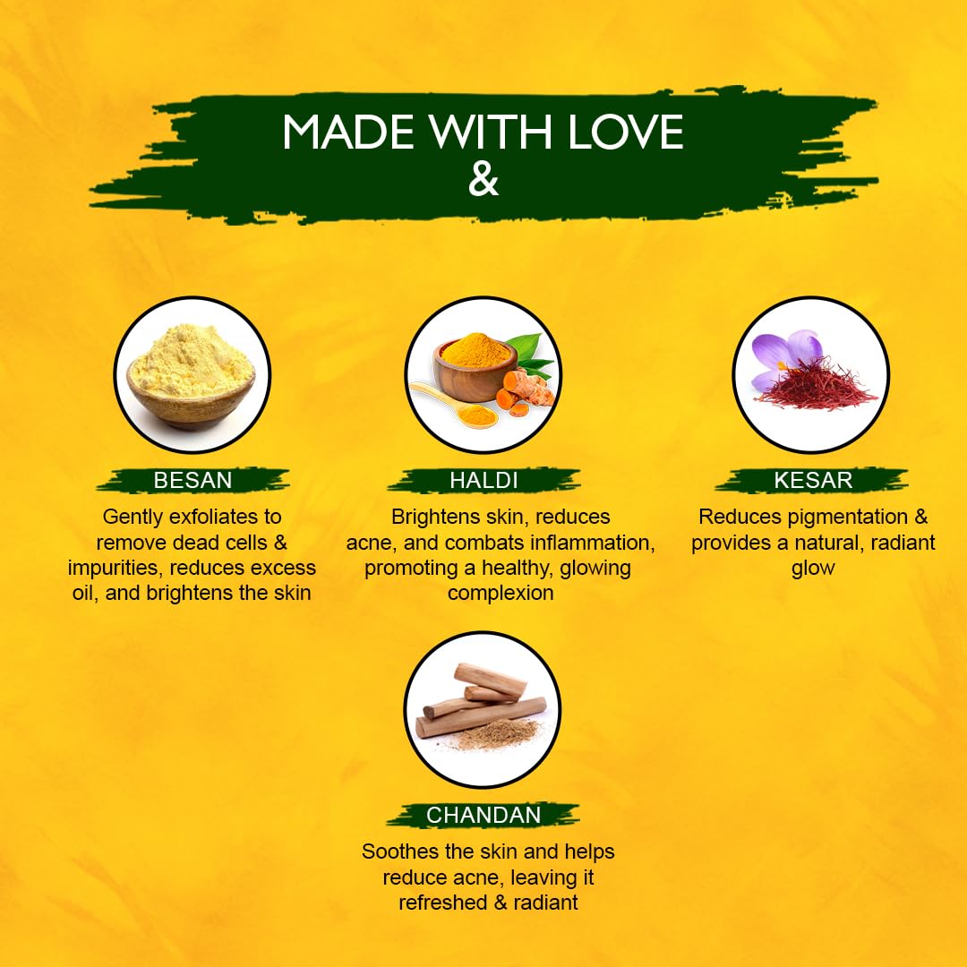 Aqua, Azadirachta indica, Besan Powder, Cocamidopropyl Betaine, Colloidal Gold, Centella Asiatica Extract, Curcuma Longa Root Ext., Disodium EDTA, Fragrance, Glyceryl Stearate (and) PEG-100 Stearate, Glycerine, Kojic Acid, Myristic Acid, Palmitic Acid, Prunus Amygdalus Dulcis Ext., PEG-7 Glyceryl Cocoate, Potassium Hydroxide Phenoxyethanol (and) Benzoic Acid (and) Capryloyl Glycine (and) Undecylenoyl Glycine, Rosa Damascena Mill Water Ext., Solum Fullonum, Stearic Acid, Santalum Album Extract, Vigna Radiata (Moong Dal)