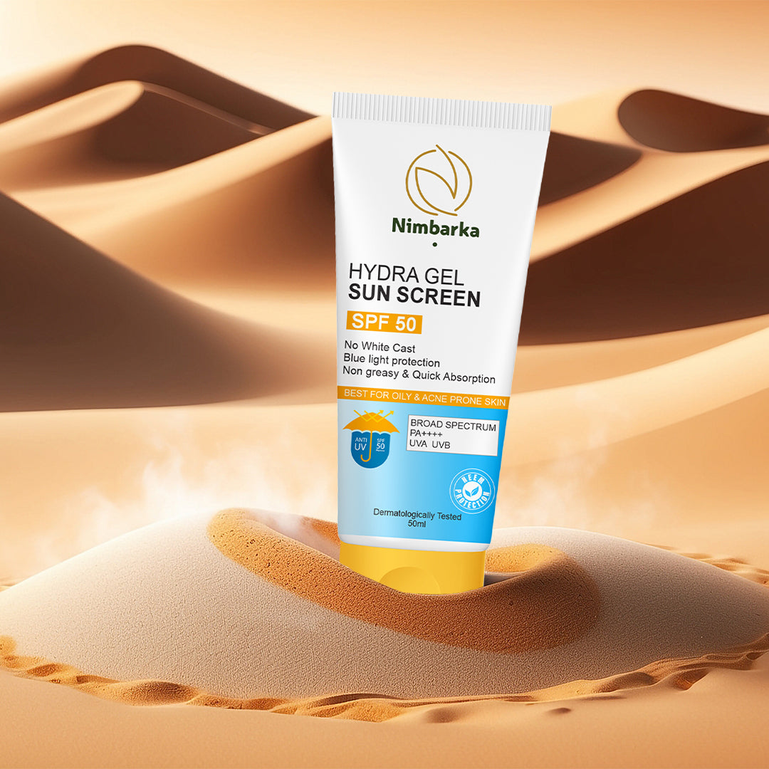 Nimbarka Hydra Gel Sunscreen SPF 50 is your ultimate daily defense against sun damage and digital light exposure. Powered with broad-spectrum UVA & UVB protection and a PA++++ rating, it also shields against harmful blue light from screens. The lightweight gel texture absorbs instantly, leaving no white cast and a non-greasy finish—perfect for all skin types, especially oily and acne-prone skin. Dermatologically tested, it hydrates while protecting against sunburn, tanning, and premature aging, keeping your skin fresh, smooth, and healthy every day.