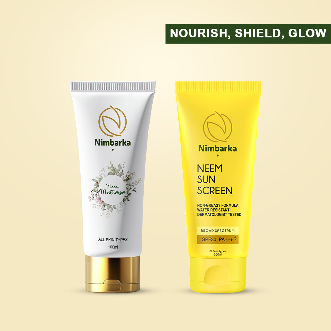 Nimbarka Hydrate & Protect Duo is your daily skincare essential for lasting hydration and sun defense. This combo pairs the Neem Moisturizer, a lightweight, non-greasy formula enriched with neem to soothe irritation, balance skin, and provide 24-hour hydration, with the Neem Sunscreen SPF 30 PA+++, a broad-spectrum, water-resistant sunscreen that shields against UVA/UVB rays while brightening and protecting skin from sun damage. Together, they keep your skin nourished, smooth, and protected all day —